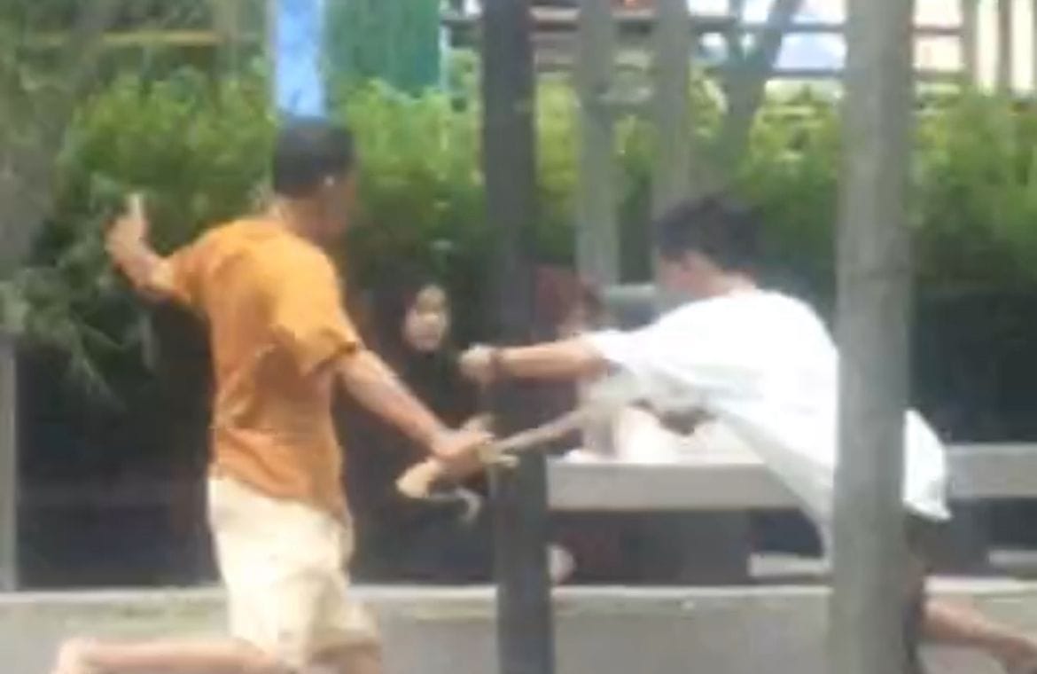 Beredar video pendek berdurasi 38 detik yang menampilkan pria berbaju kuning menggunakan parang mengejar pemuda baju putih.