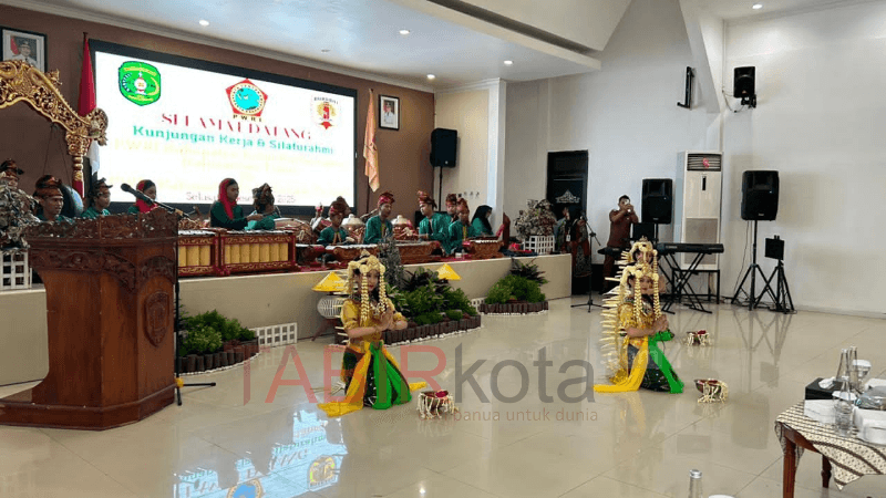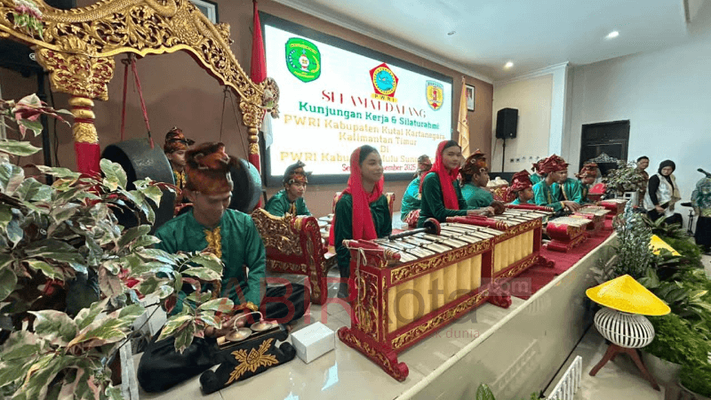 ADING BASTARI BARIKIN (BARABAI, TABIRkota) — Saat kunjungan Persatuan Wredatama Republik Indonesia (PWRI) Kutai Kartanegara, Kalimantan Timur (Kaltim) di Kabupaten Hulu Sungai Tengah (HST), Kalimantan Selatan (Kalsel), para pensiunan Pegawai Negeri Sipil (PNS) disambut dengan salah satu Warisan Budaya tak Benda (WBtb) dan diakui UNESCO yang berasal dari HST, yakni Gamalan Banjar yang dimainkan oleh Sanggar Ading Bastari Barikin (foto: TABIRkota/ferian sadikin)