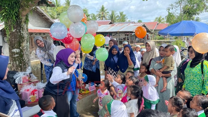 HIBUR BALITA TERDAMPAK BANJIR (BARABAI, TABIRkota) — Ketua Pembina Posyandu Kabupaten Hulu Sungai Tengah (HST), Kalimantan Selatan (Kalsel), Deni Era Yulyantie menghibur balita korban terdampak banjir, di Desa Kayu Rabah, Kecamatan Pandawan dengan memberikan balon, Selasa (13/1). (foto: TABIRkota/ferian sadikin)